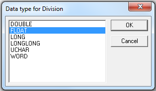 | Y | O | UCHAR, WORD, LONG, LONGLONG, FLOAT, DOUBLE | Quotient |