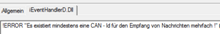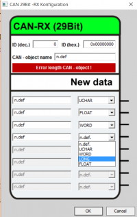 Errors during ID giving (decimal/hexadecimal are possible) or configuration of the length of the message (maximum 8 Byte above the assigned data types) are noted accordingly.