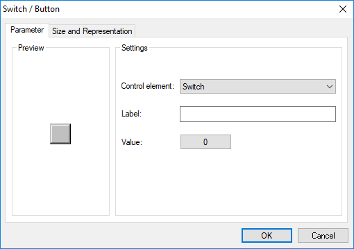 Basic parameters are configured in the first view. These are the operation mode as switch or as push button, the optional label and the start value (for switches only).