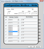 This block enables the configuration of register addresses for which the master has writing access. According to the data model “Modbus”, “Coils” and “Holding Register” are supported. Addressing is 0 based.