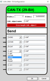 Errors during ID giving (decimal/hexadecimal are possible) or configuration of the length of the message (maximum 8 Byte above the assigned data types) are noted accordingly.