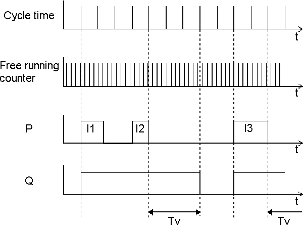 The output Q will change to a logic 0 after a time Tv from a negative transition on P. The real delay time is the value of Tv rounded up to the next cycle; in practice this means that only delay times which are multiples of the cycle time can be realized. Tv is given as a float value, expressed in seconds. Tv may have a value smaller than one second, but may not be negative.